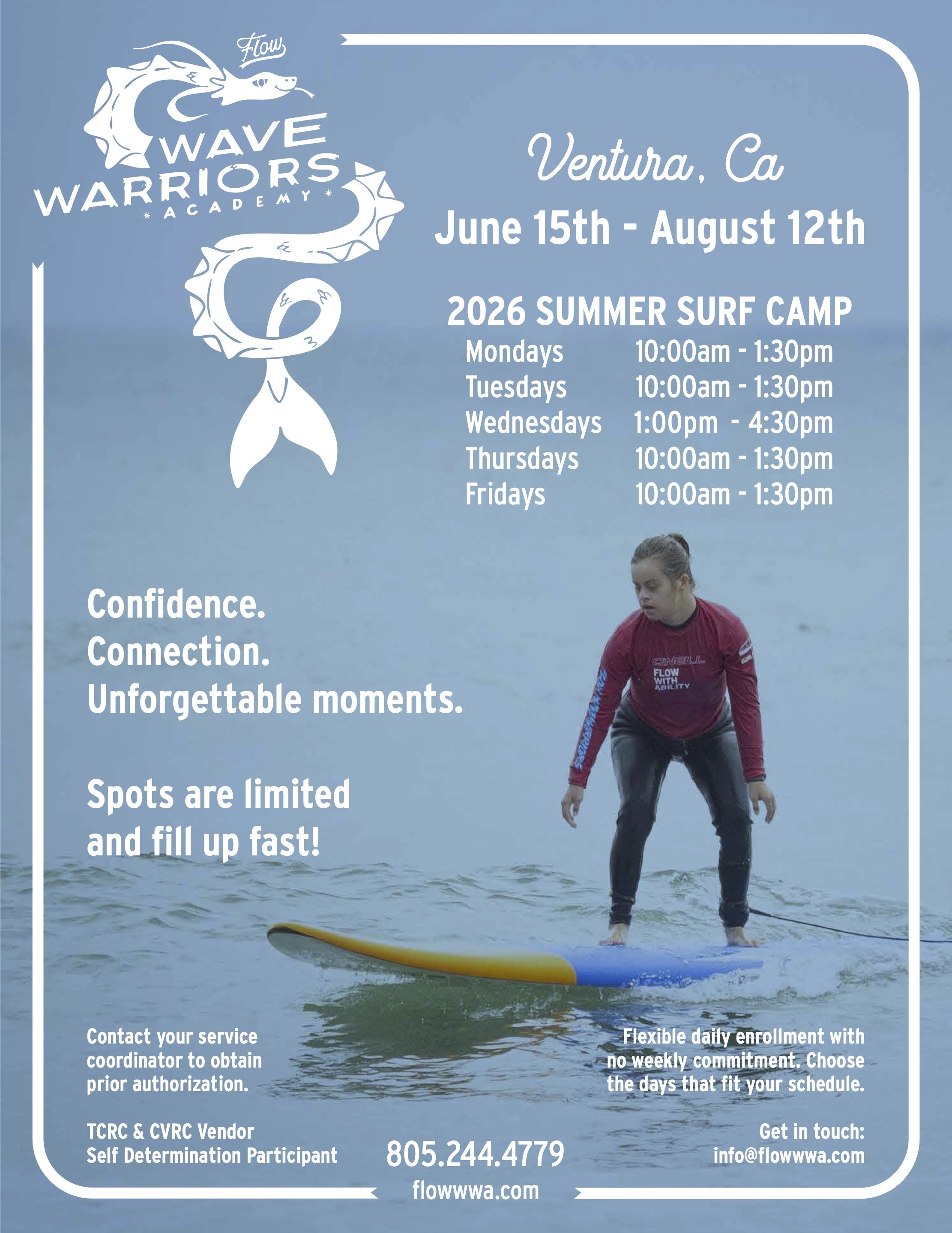 1.5-hour 1-to-1 adaptive surf lessons beginning with an individualized participant assessment. Using the Flow Method™, coaching is structured to support functional development, safety, and independence through consistent routines and progressive skill building aligned with IPP goals. Flow Wave Warriors Academy is an approved vendor with California Regional Centers and serves Self-Determination Program participants.